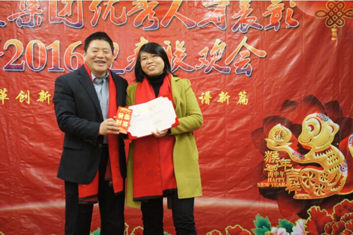联欢会首先举行了集团2015年优秀人才表彰,史飞飞、谢福中、高丽等人获得了“优秀管理骨干”、“优秀岗位辅导员”、“优秀员工”荣誉称号,计划财务部唐茂成获得了2015年集团“金牌员工”荣誉称号,与会领导为他们颁发了荣誉证书及奖金,并希望他们再接再厉,取得更好成绩,唐茂成发表了获奖感言,对集团的培养表示感谢。 今年的联欢会新增了微信抢红包环节,工会主席张端时为大家发了几个大红包,大家争着打开手机抢运气,抢到的人兴高采烈,抢不到的人同样因为参与而分外开心。